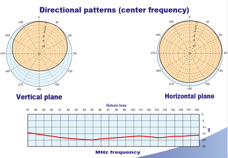 – Gain ratio: 0.7 dBd (relative to a half-wave radiator at a frequency of 98 MHz)