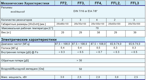 Полосовые фильтры, на основе коаксиальных объемных резонаторов, применяются между выходом передатчика и антенной для подавления внеполосных излучений и интермодуляционных помех. Фильтры данного типа, могут включать как один, так и несколько последовательно включенных резонаторов. Технические характеристики фильтров приведены в таблице.